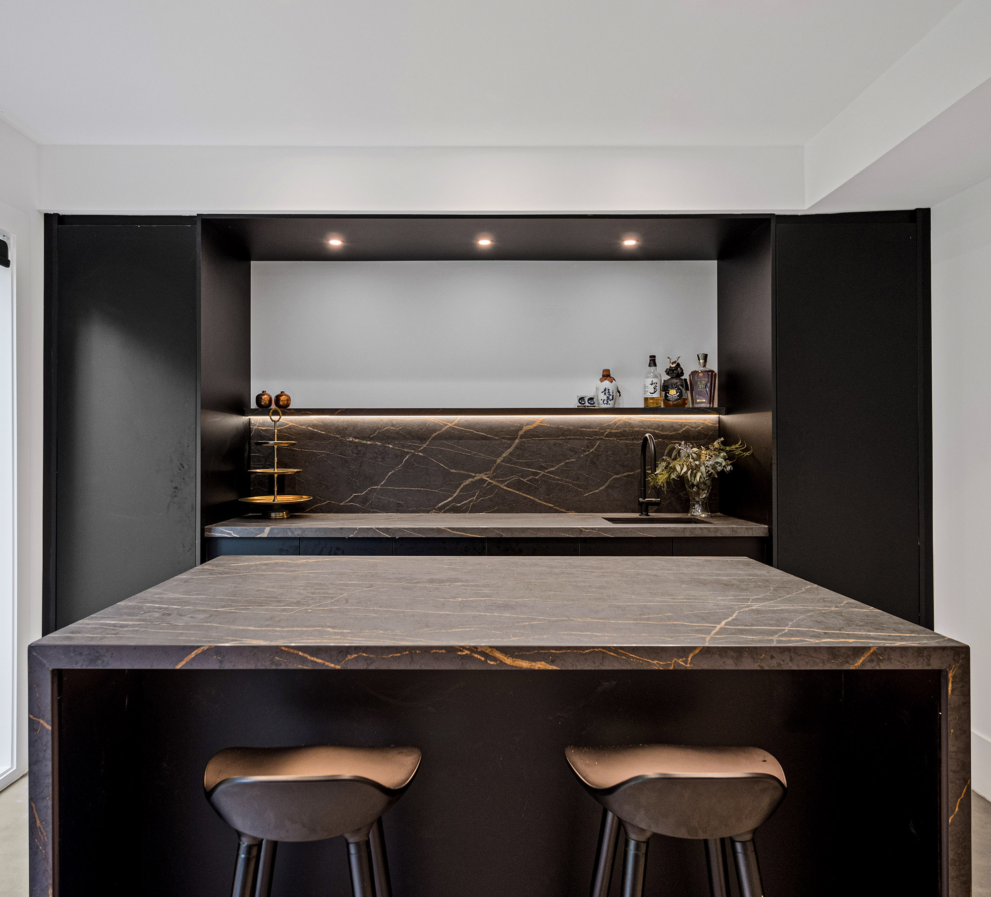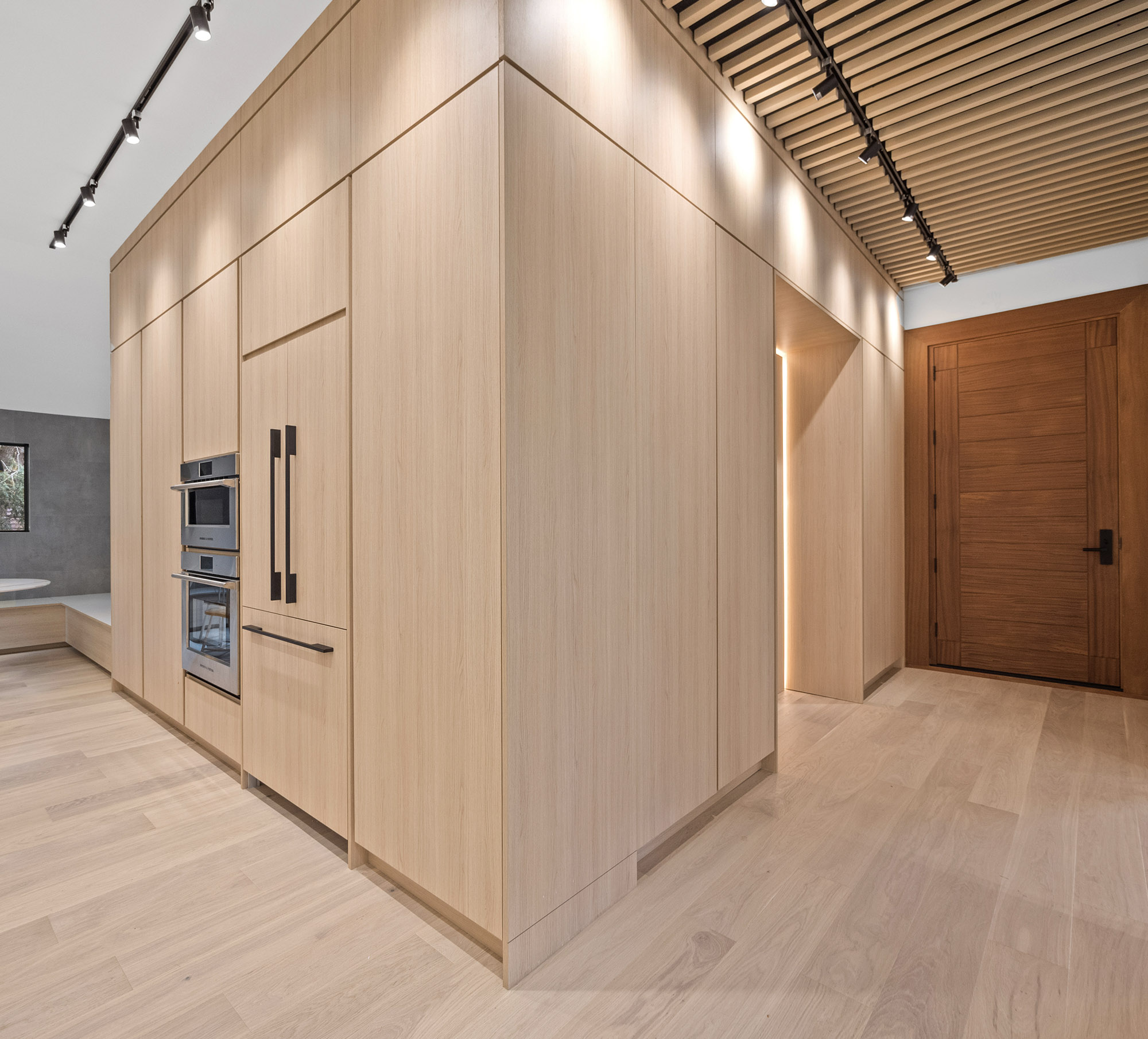 Key to the transformation was rebuilding the roof truss system to raise the main floor ceiling to an impressive 12 feet. Thoughtful reconfiguration of load-bearing walls and a grand entrance foyer seamlessly integrated with the kitchen created a spacious, cohesive flow. Continuous millwork adds elegance and unity throughout the home. The result is a stunning modern living space where form and function harmonize beautifully—a true masterpiece tailored for this dynamic duo.