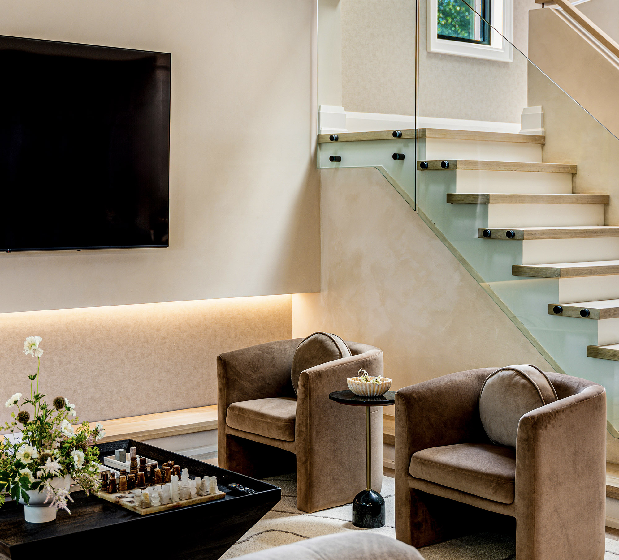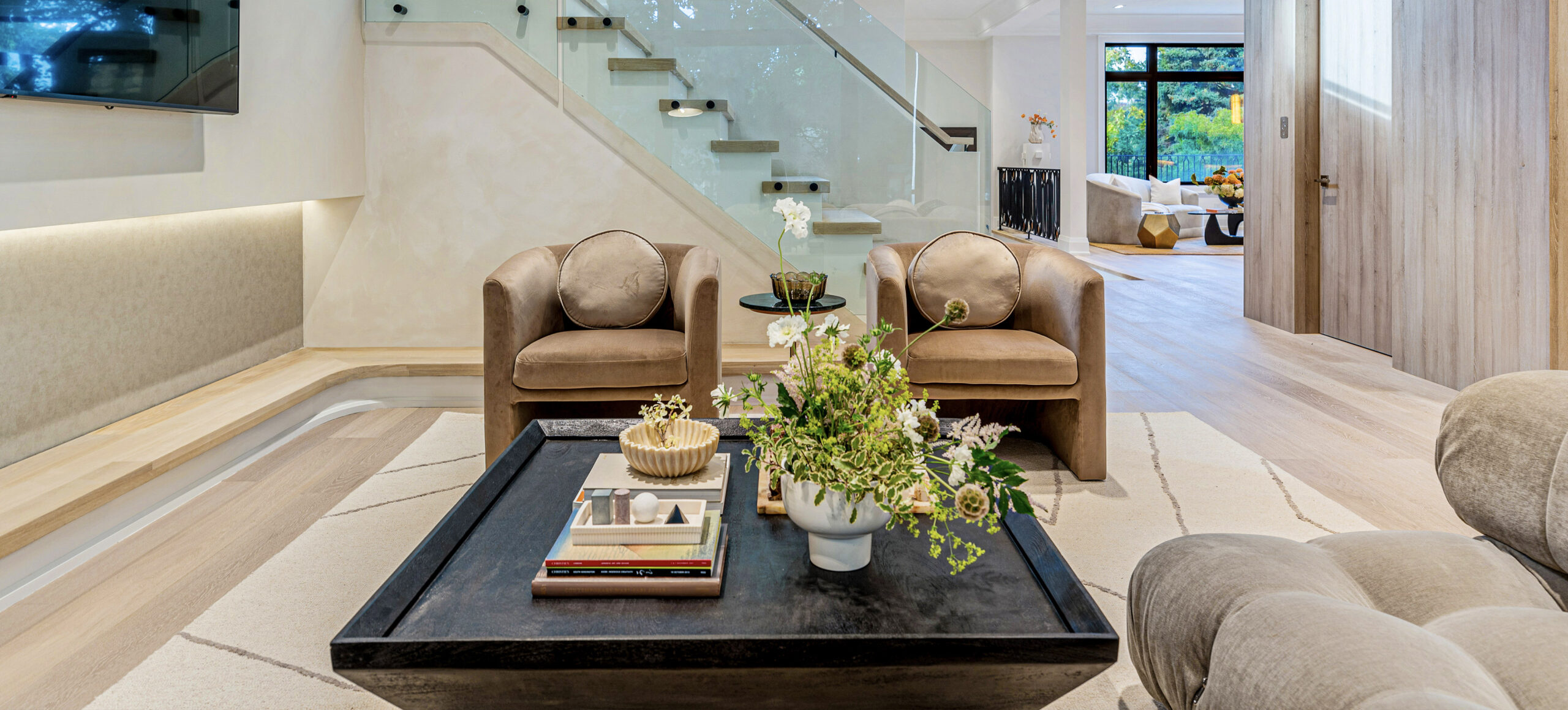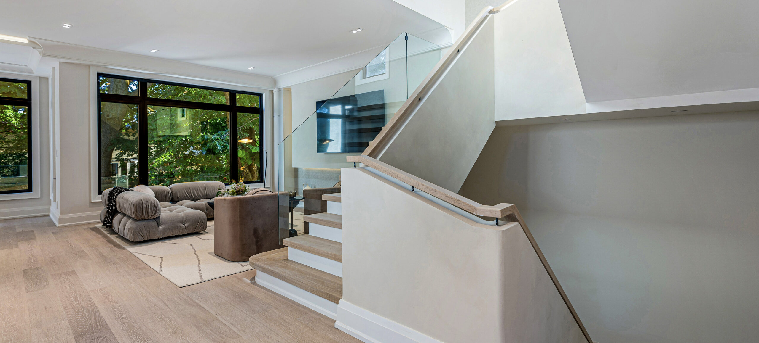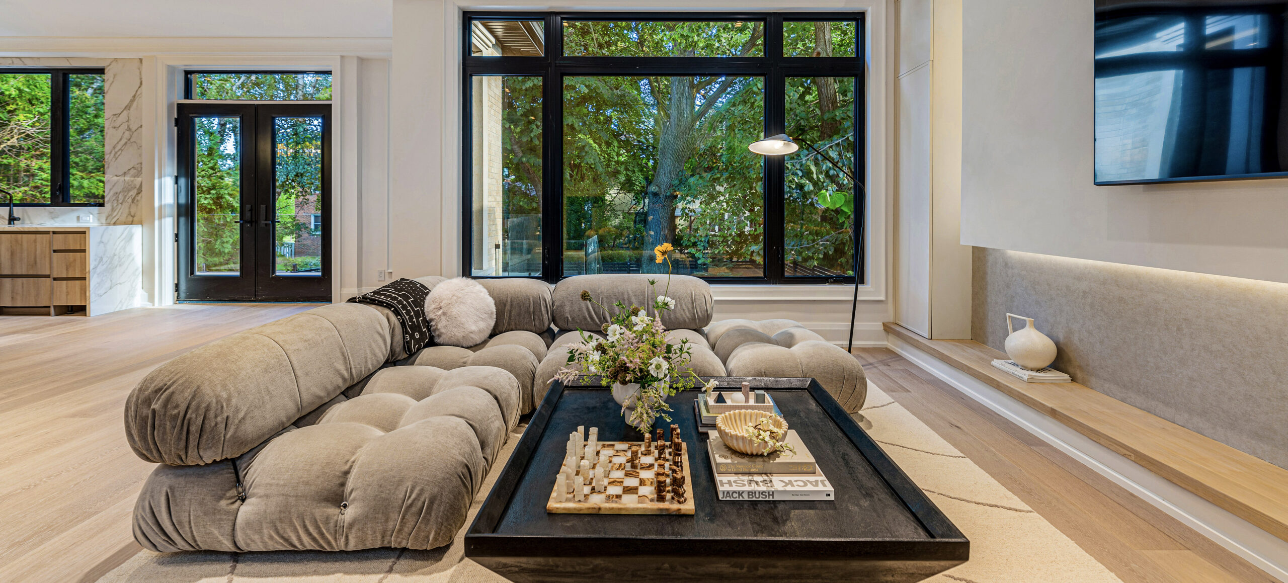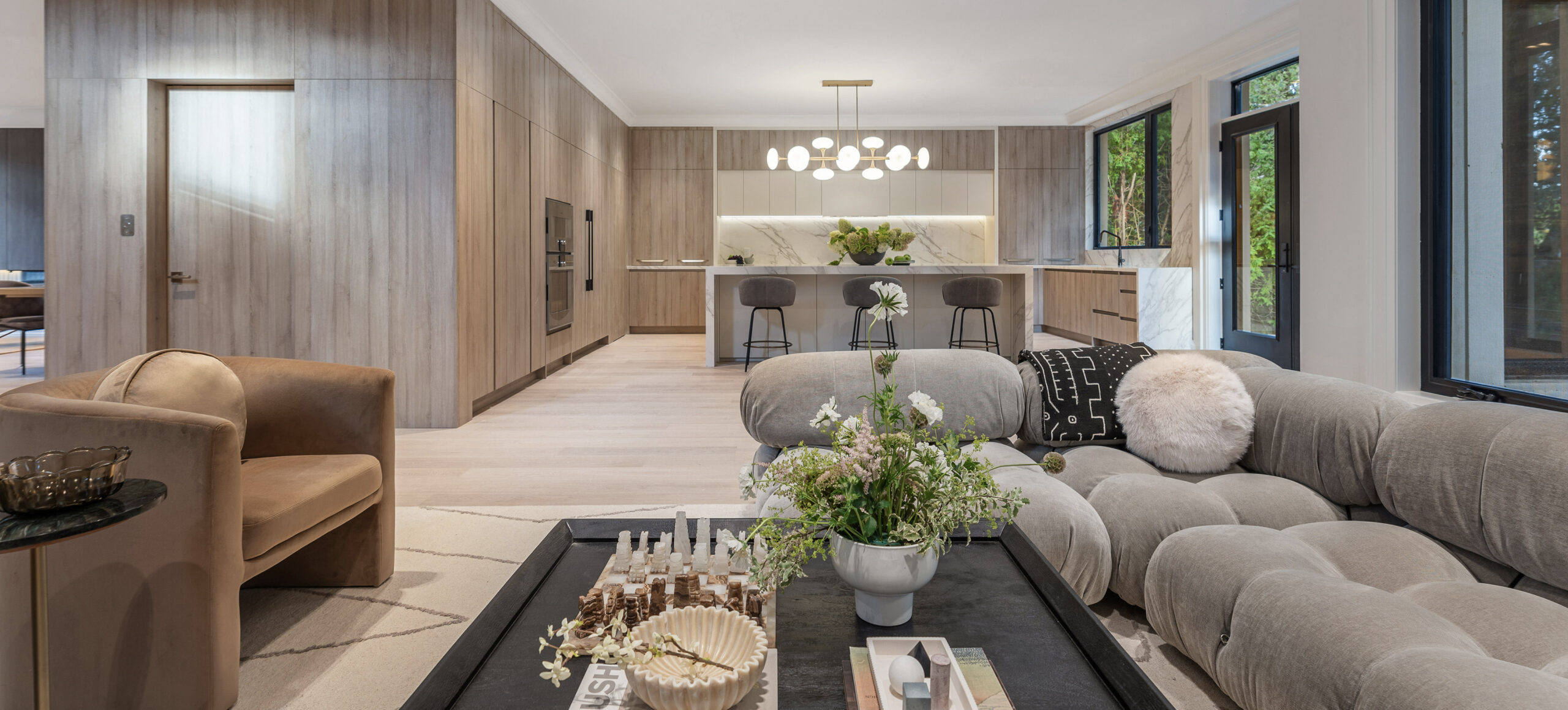 Inside, a neutral, monochromatic palette of soft greys, off-whites, and warm taupes sets a calm, inviting tone. Large windows and skylights flood the space with natural light, framing views of surrounding greenery while enhancing textures and warmth. The open layout connects the living area and kitchen into a relaxed, functional hub. Wood accents in built-ins, flooring, and trims add tactile contrast, balancing the clean, uncluttered surfaces. The result is a spacious yet cozy home, where natural light and minimal furnishings create a serene atmosphere of quiet sophistication and comfort.