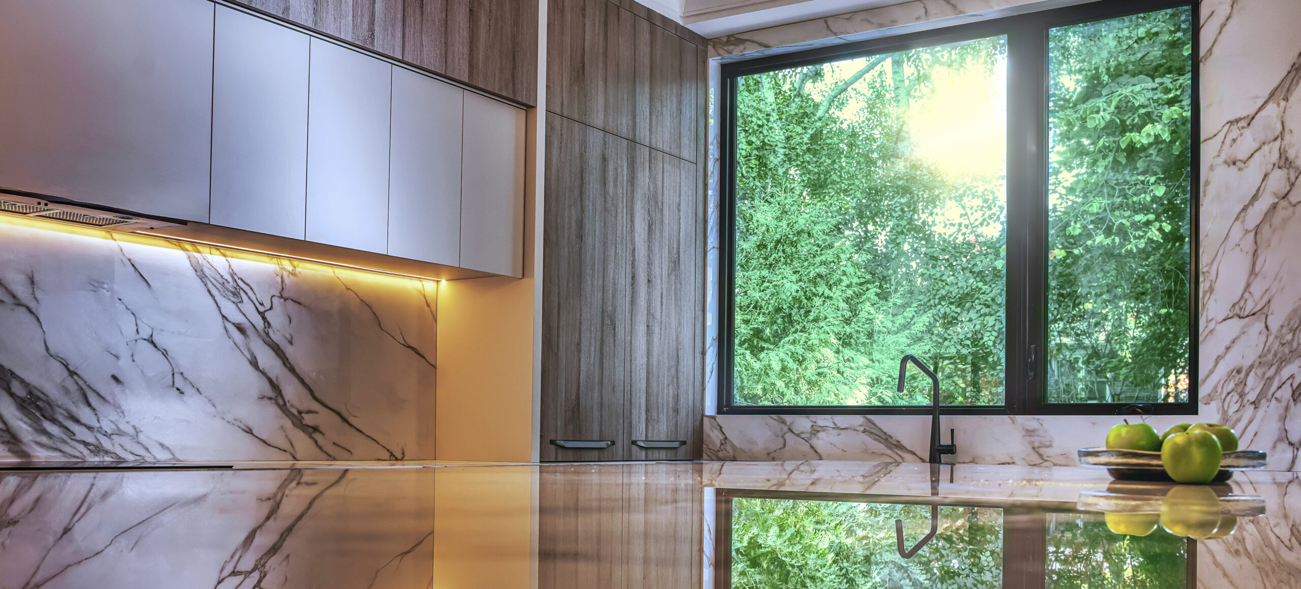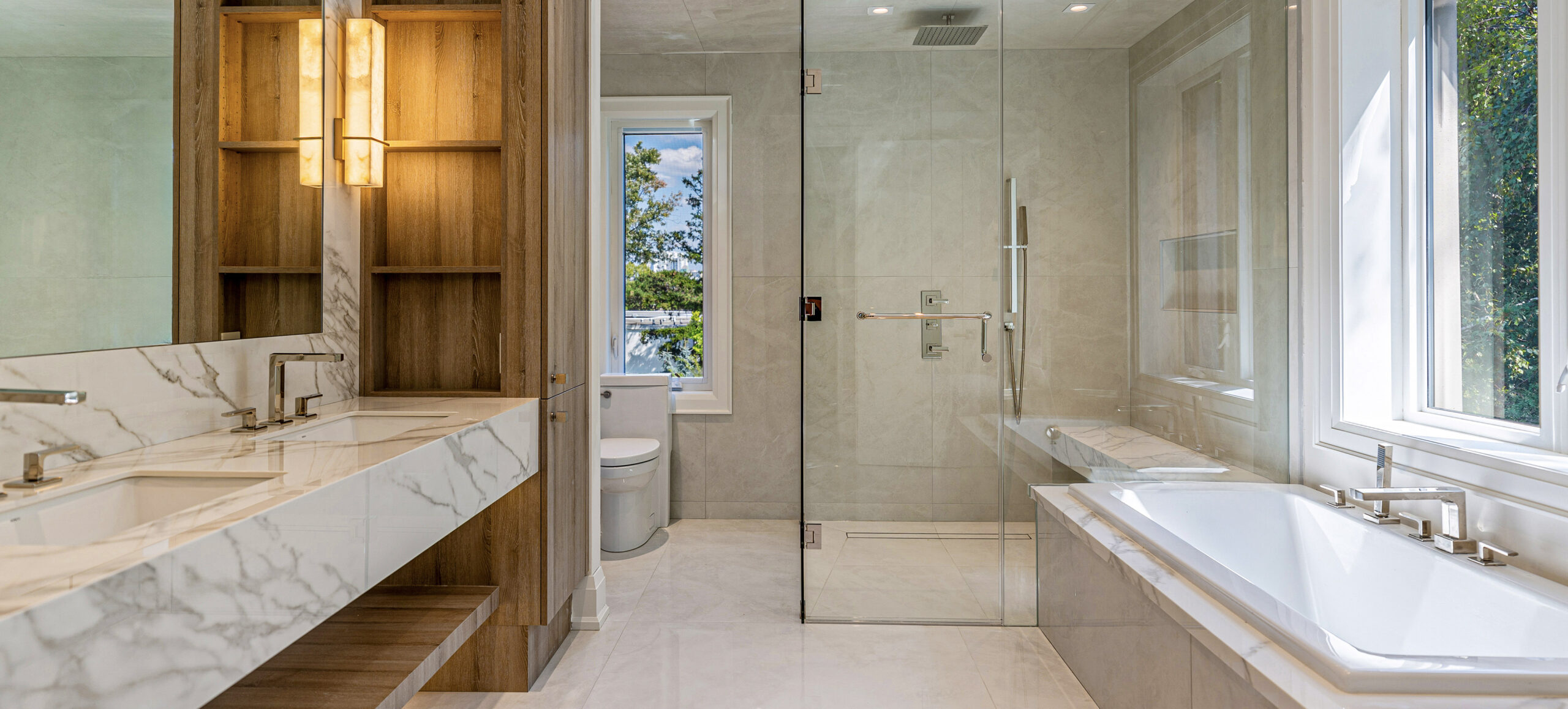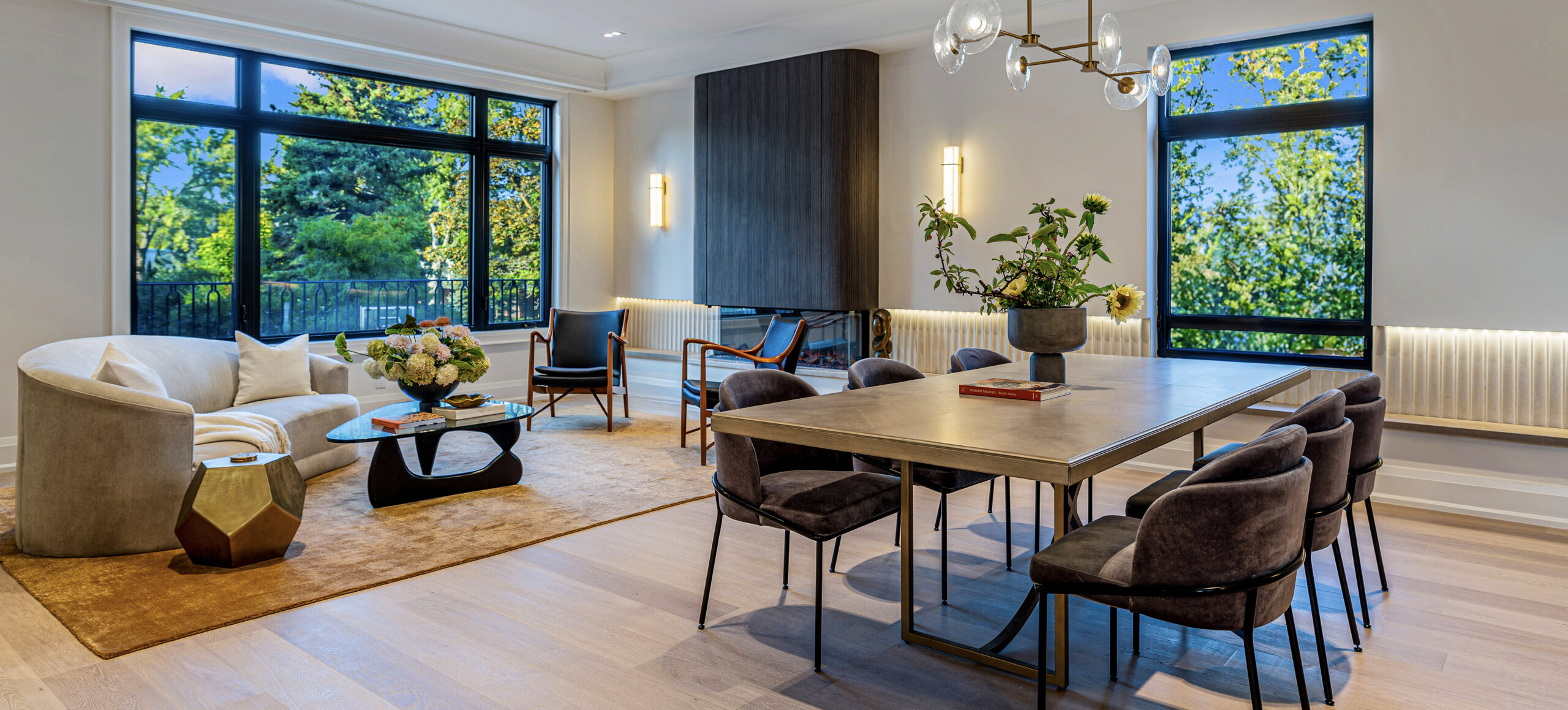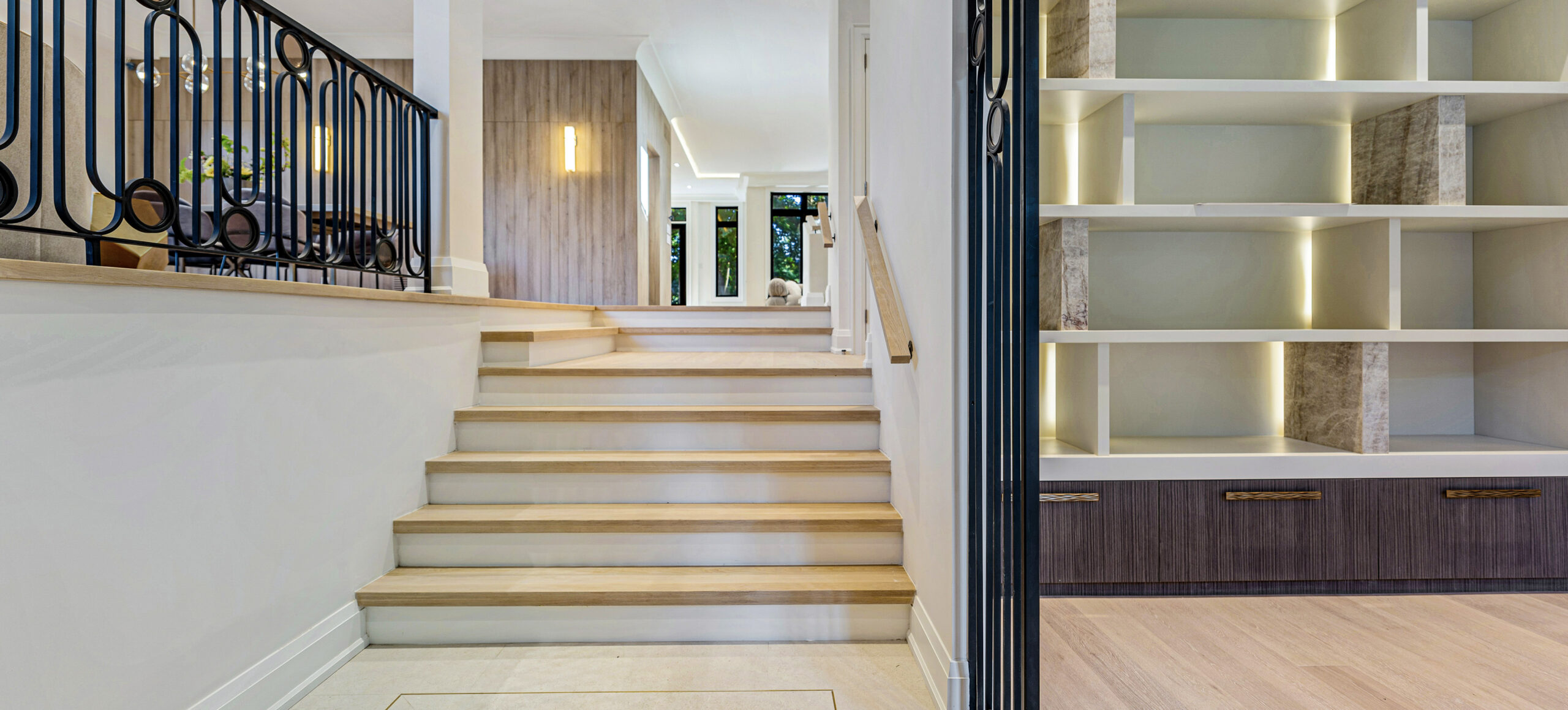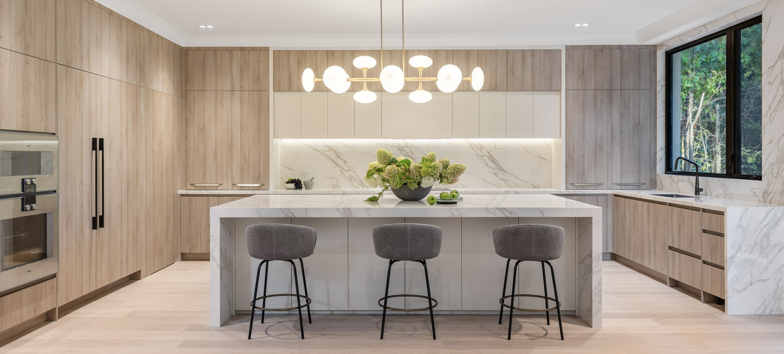 Inside, a neutral, monochromatic palette of soft greys, off-whites, and warm taupes sets a calm, inviting tone. Large windows and skylights flood the space with natural light, framing views of surrounding greenery while enhancing textures and warmth. The open layout connects the living area and kitchen into a relaxed, functional hub. Wood accents in built-ins, flooring, and trims add tactile contrast, balancing the clean, uncluttered surfaces. The result is a spacious yet cozy home, where natural light and minimal furnishings create a serene atmosphere of quiet sophistication and comfort.