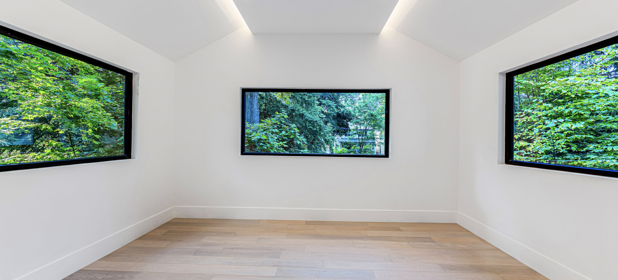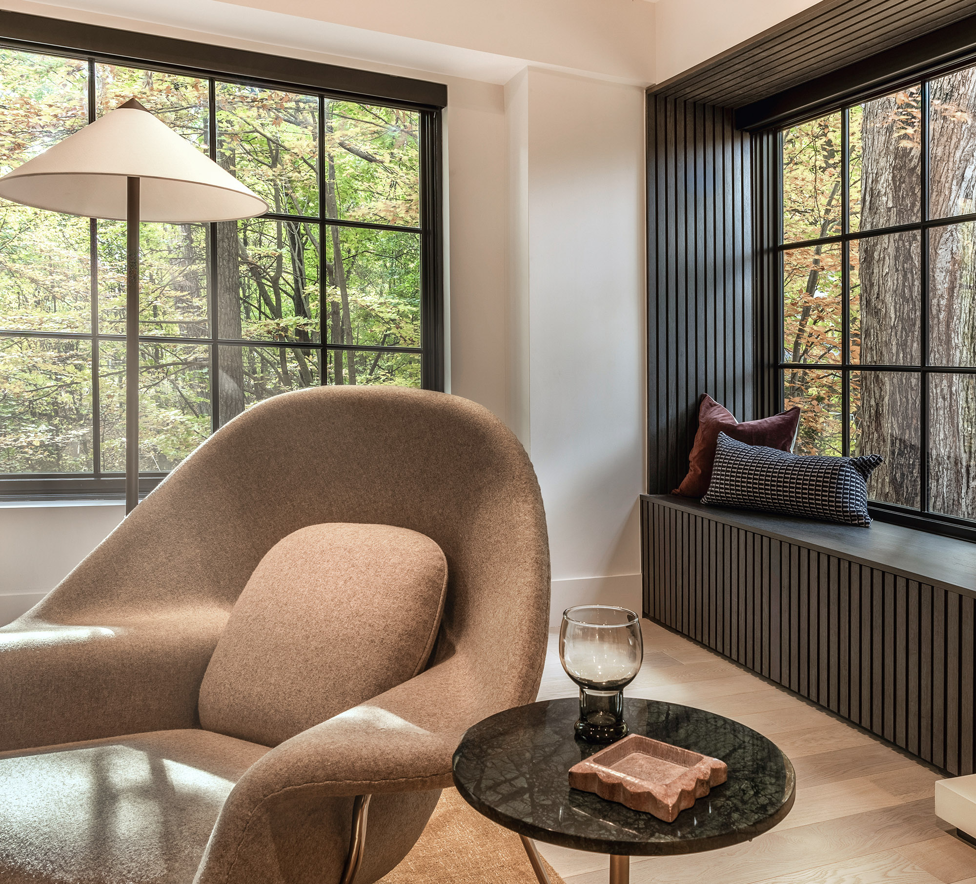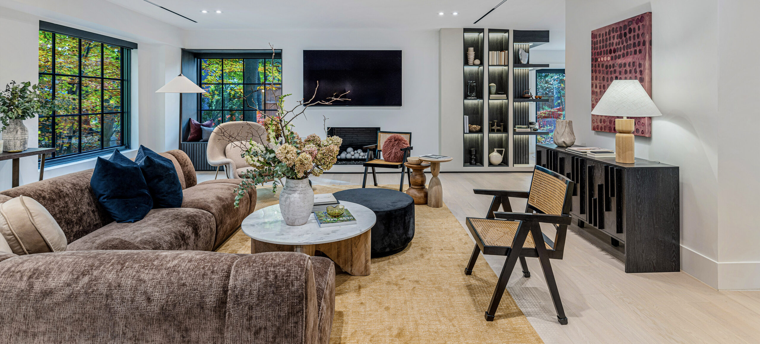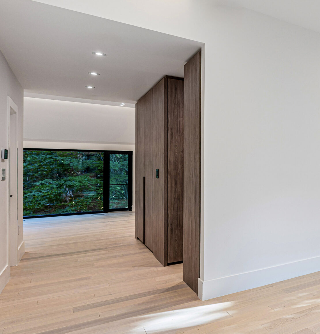 Floor-to-ceiling windows and sliding doors open the main level to the backyard, filling shared spaces with natural light. Pale walls and warm wood tones reflect daylight, creating a calm, welcoming flow ideal for family living and entertaining. The muted exterior palette of off-white stucco and charcoal accents is echoed inside with soft plaster walls, light flooring, and dark metal trim, allowing materials to shine in a serene, tactile environment. Open-plan living areas on the ground floor flow effortlessly, while private bedrooms upstairs offer generous windows and balconies with views of treetops. The Kimbark Residence balances humility and modernity, respecting its heritage context while delivering a bold, contemporary home perfect for today’s urban family.
