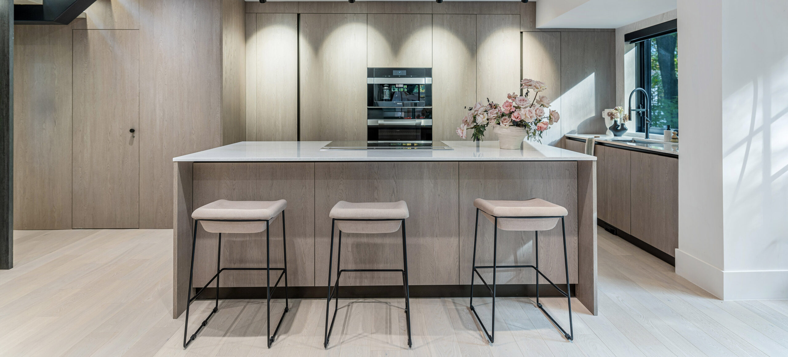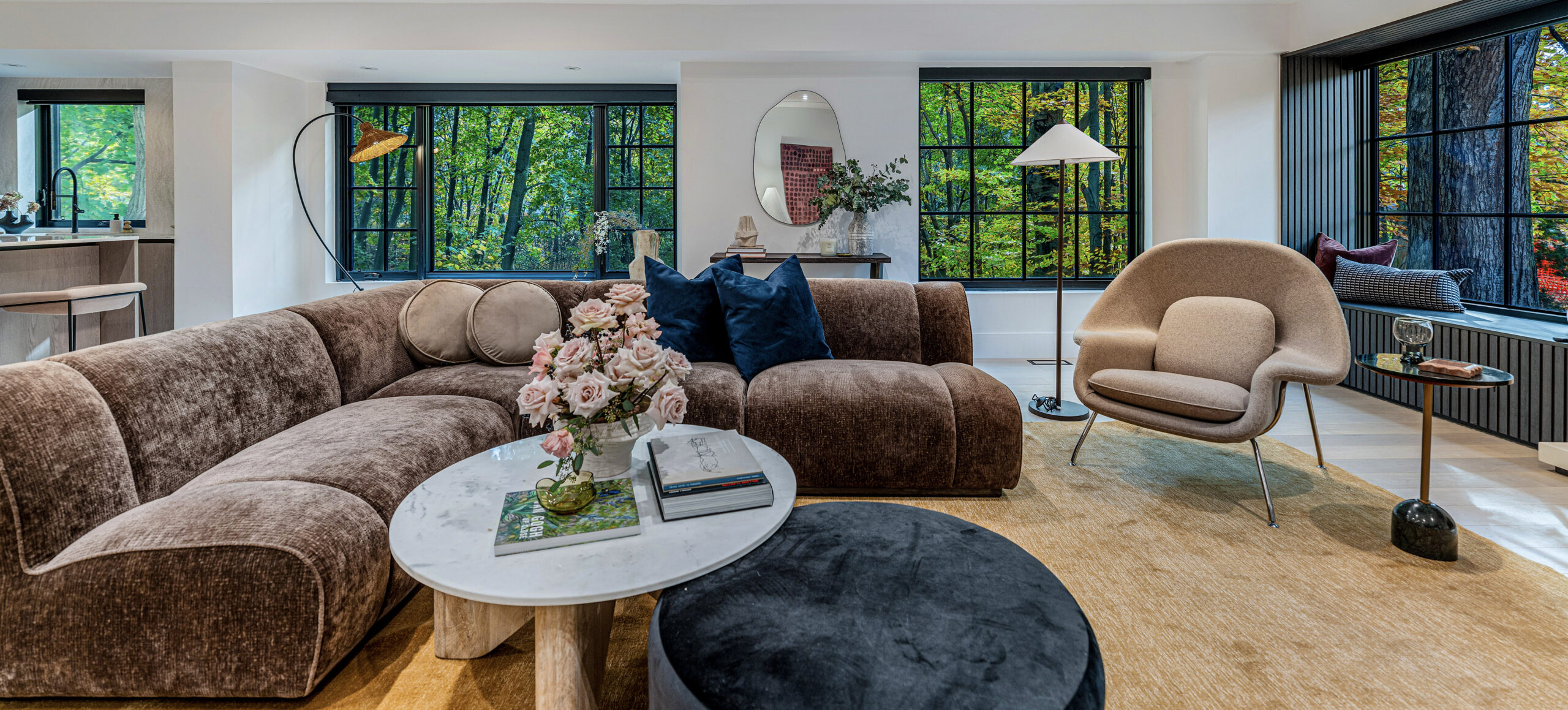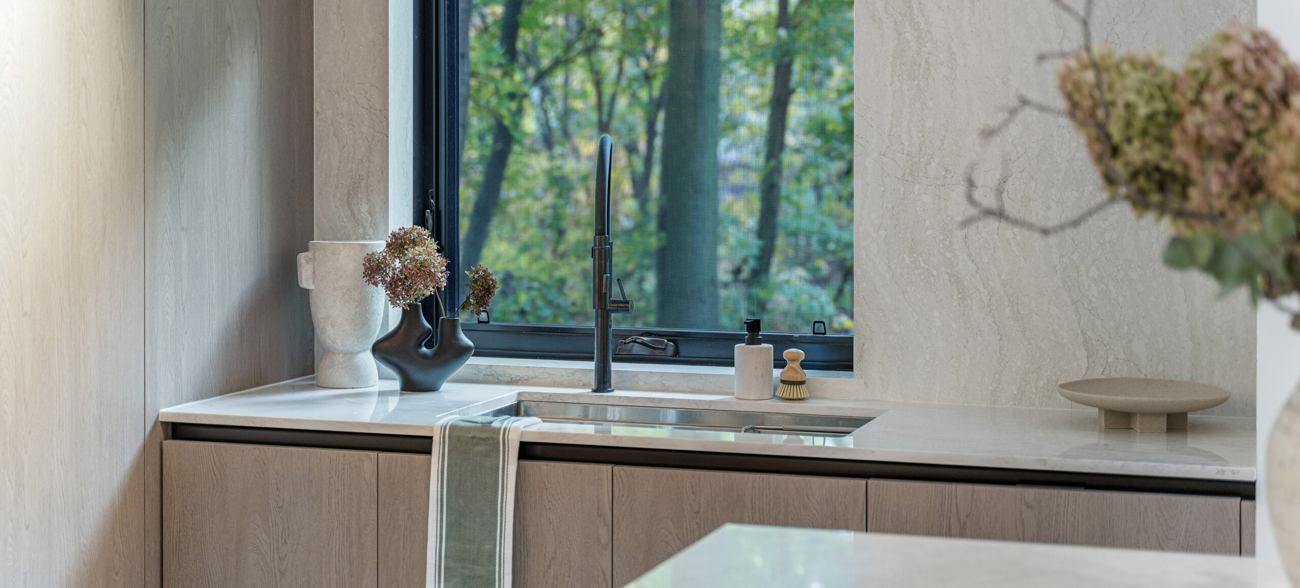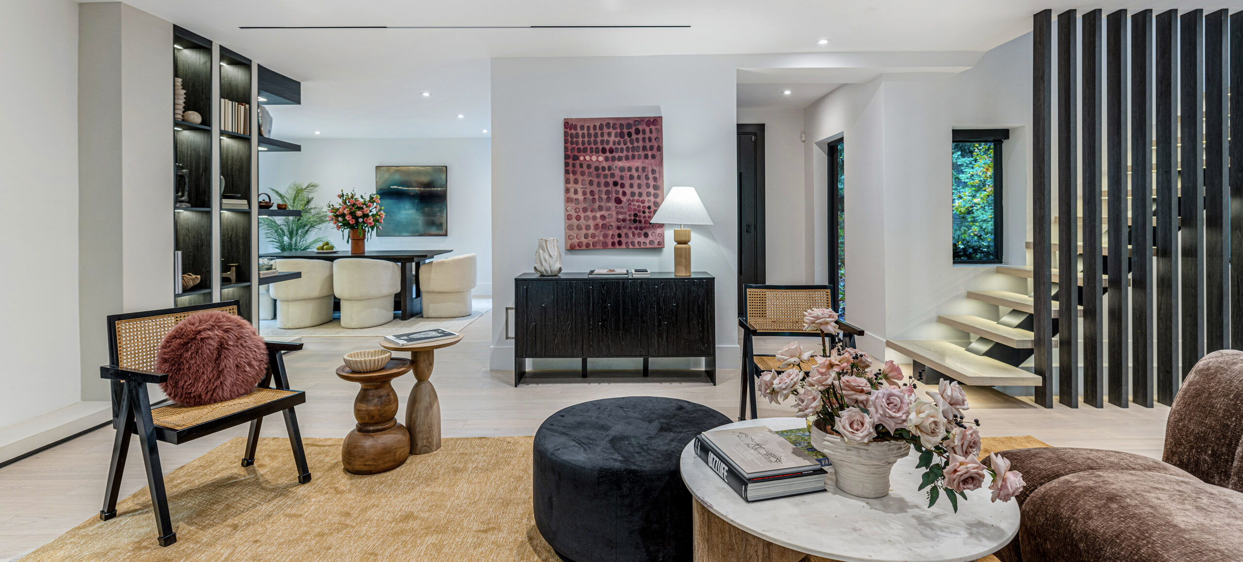 Floor-to-ceiling windows and sliding doors open the main level to the backyard, filling shared spaces with natural light. Pale walls and warm wood tones reflect daylight, creating a calm, welcoming flow ideal for family living and entertaining. The muted exterior palette of off-white stucco and charcoal accents is echoed inside with soft plaster walls, light flooring, and dark metal trim, allowing materials to shine in a serene, tactile environment. Open-plan living areas on the ground floor flow effortlessly, while private bedrooms upstairs offer generous windows and balconies with views of treetops. The Kimbark Residence balances humility and modernity, respecting its heritage context while delivering a bold, contemporary home perfect for today’s urban family.