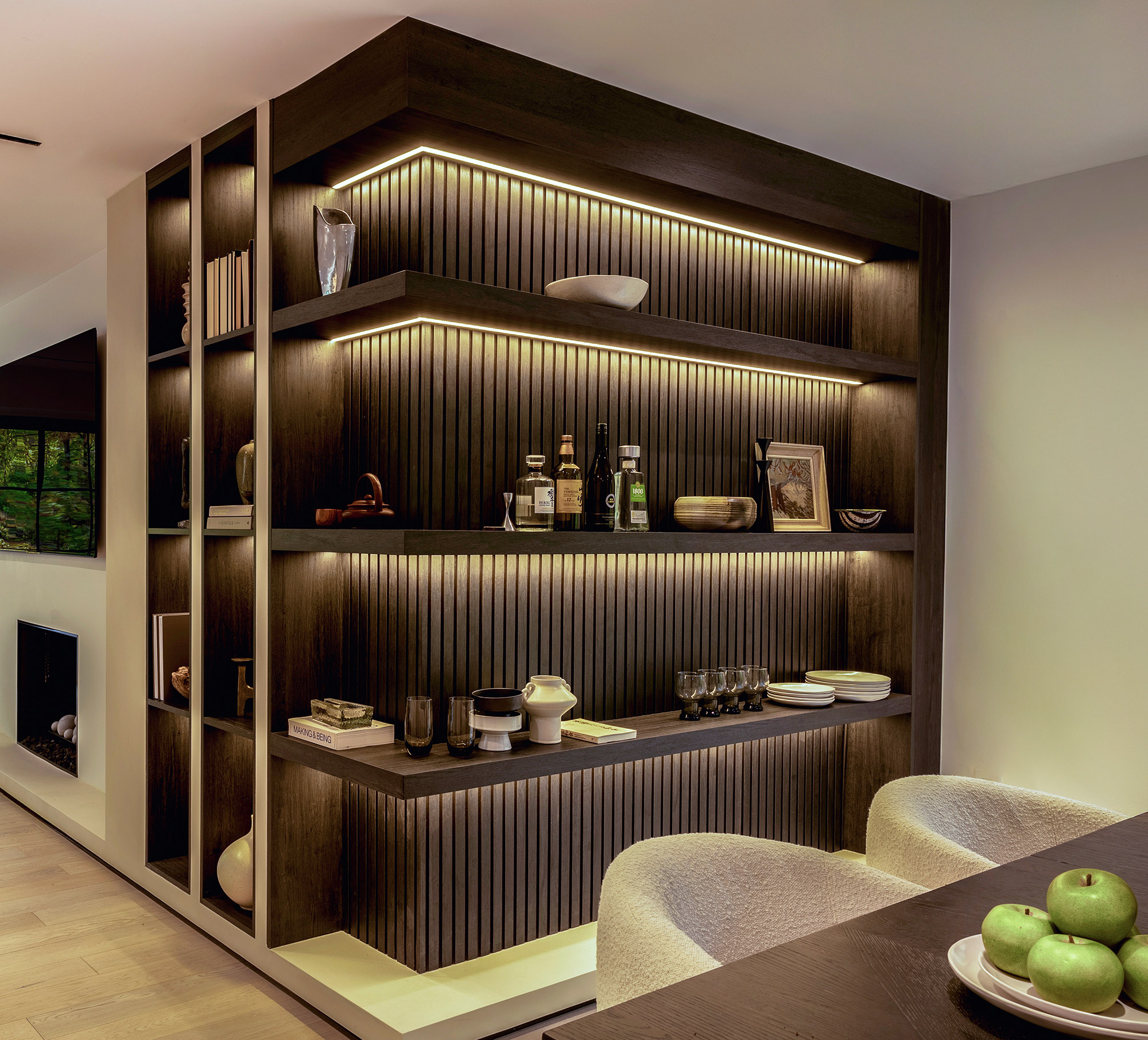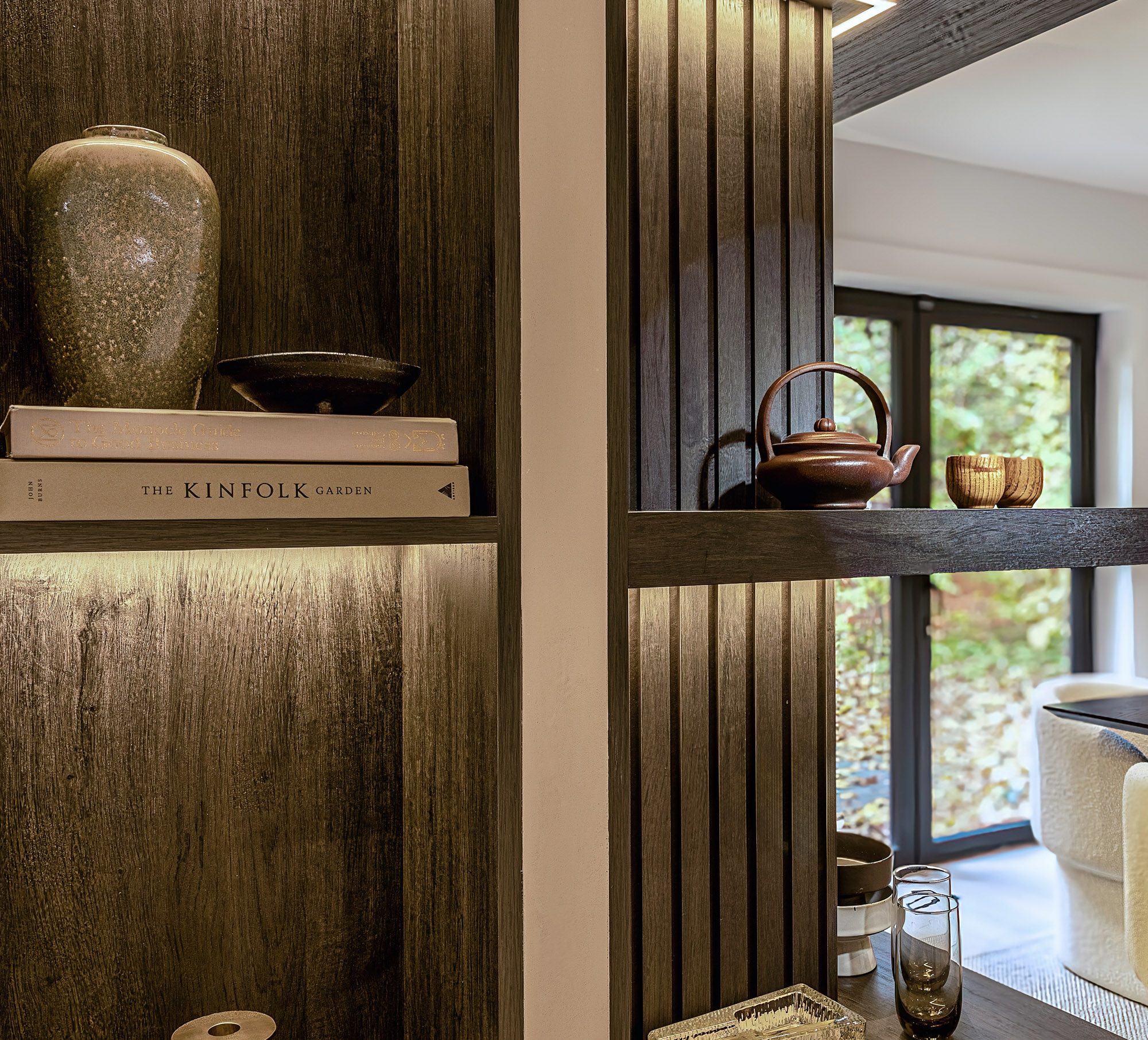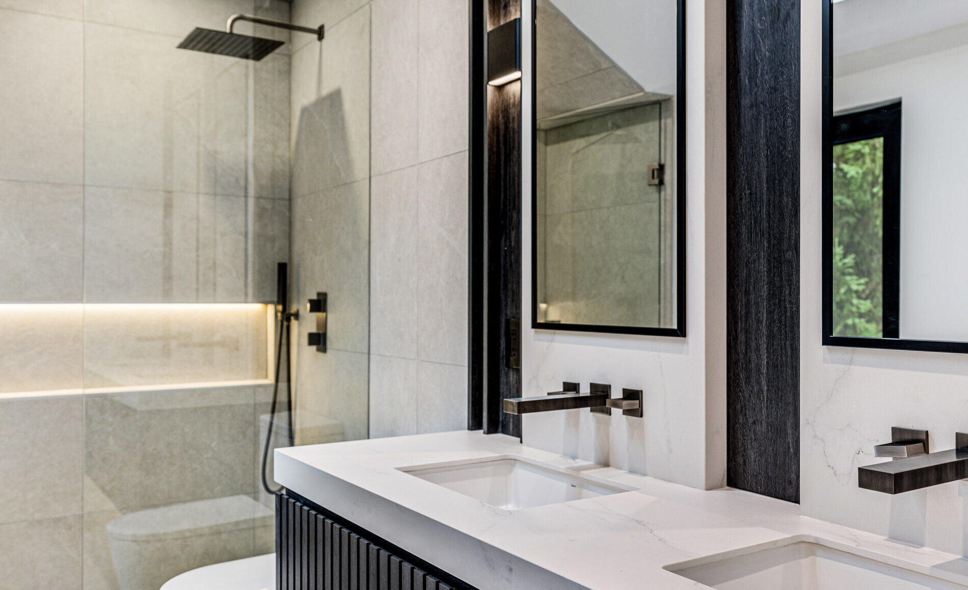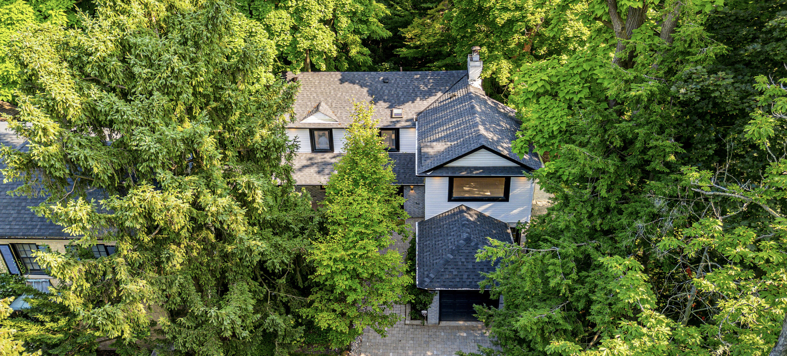 The Kimbark Residence, set on a classic urban lot, thoughtfully blends contemporary architecture with its traditional surroundings. Clean cubic forms and dark window frames create a refined, refreshed presence, while a sculptural balcony and recessed porch add depth and shadow, engaging the leafy street without overpowering it. The design balances angled and vertical elements that echo the rhythm of neighboring homes, asserting a modern yet subtle identity.