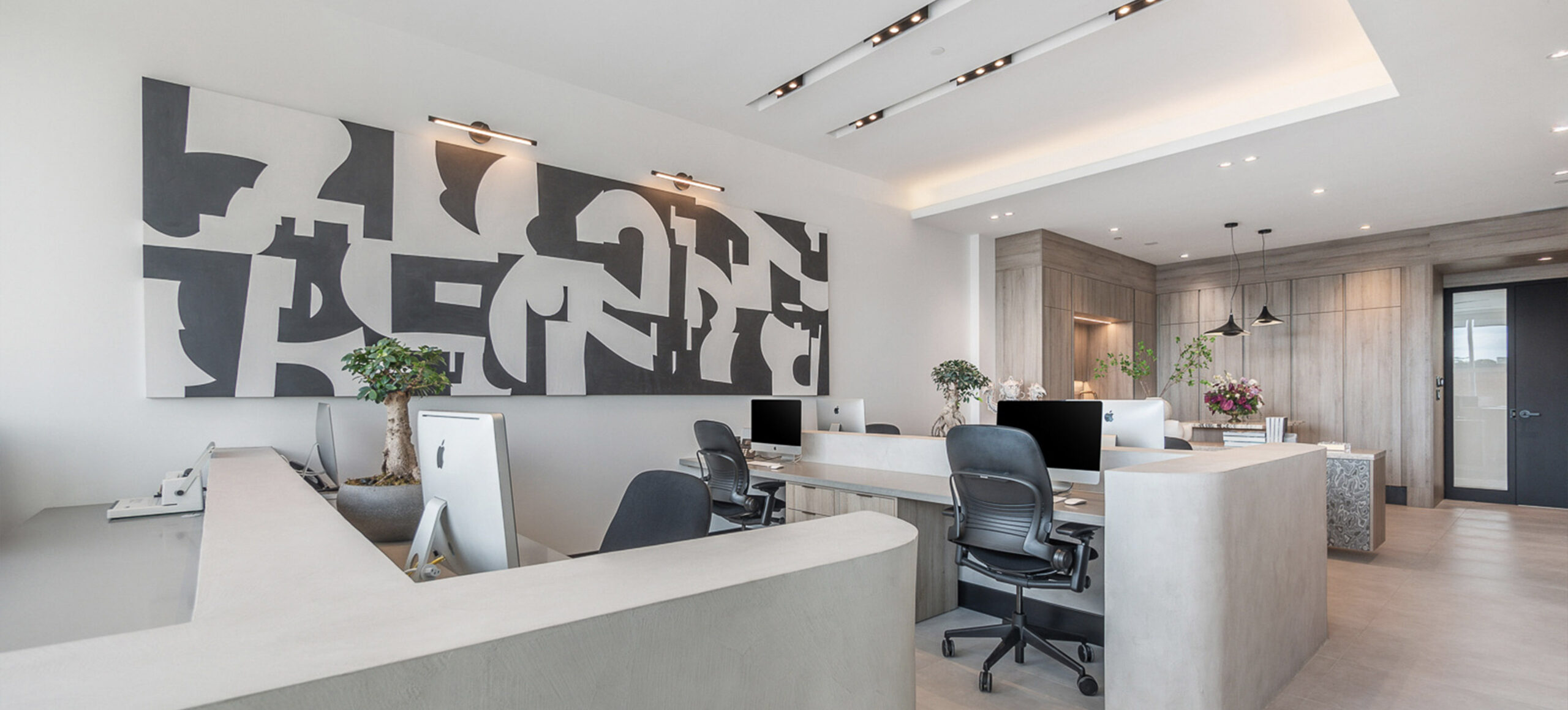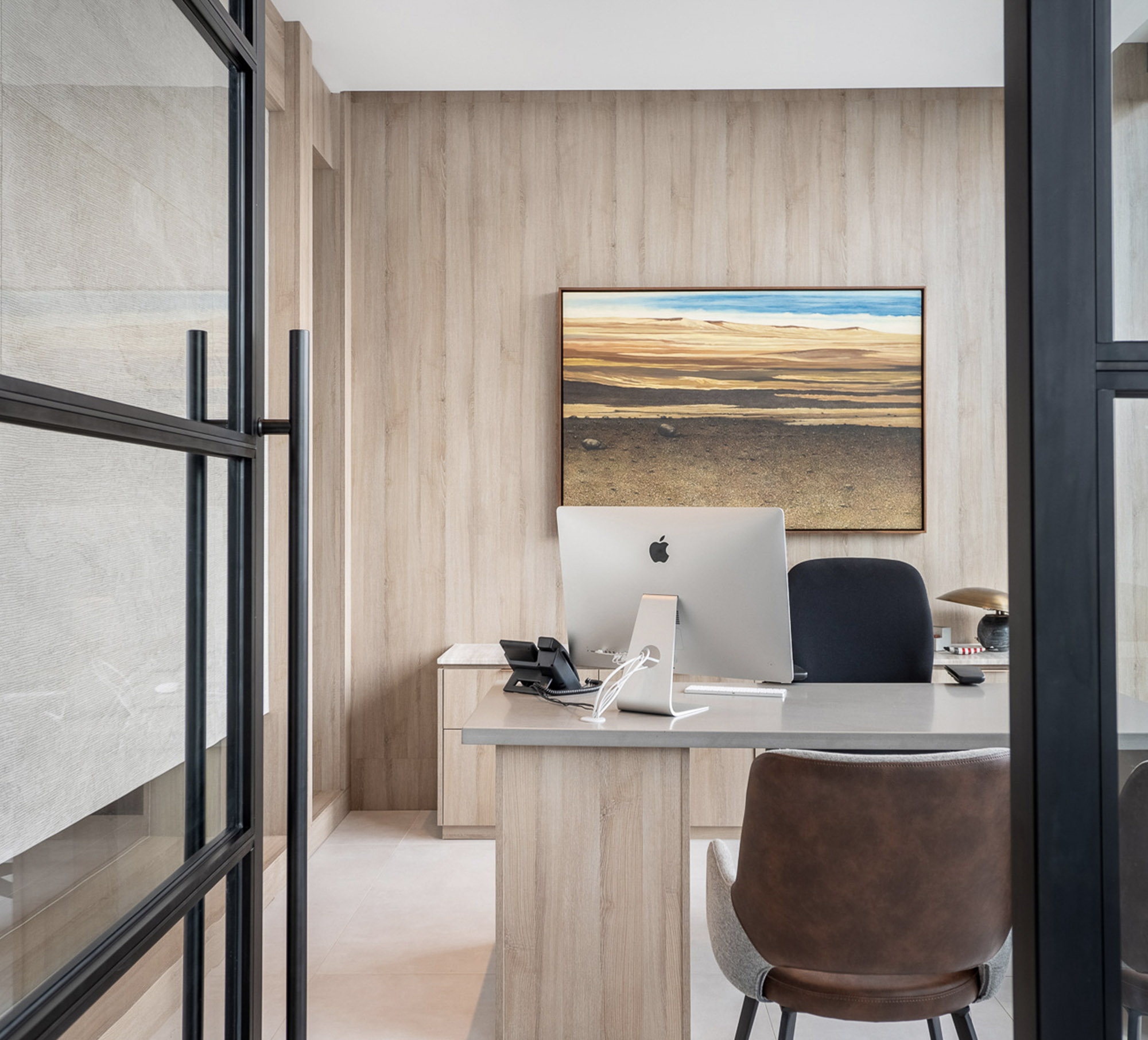 A standout feature of the office is its central espresso bar, which acts as a social and professional hub. Encouraging spontaneous interactions among team members, clients, and visitors, it reinforces a culture centered on construction expertise and engagement. With eight spacious workstations and a sleek executive office, the space supports teamwork and productivity while showcasing Pionova’s forward-thinking approach to construction management.