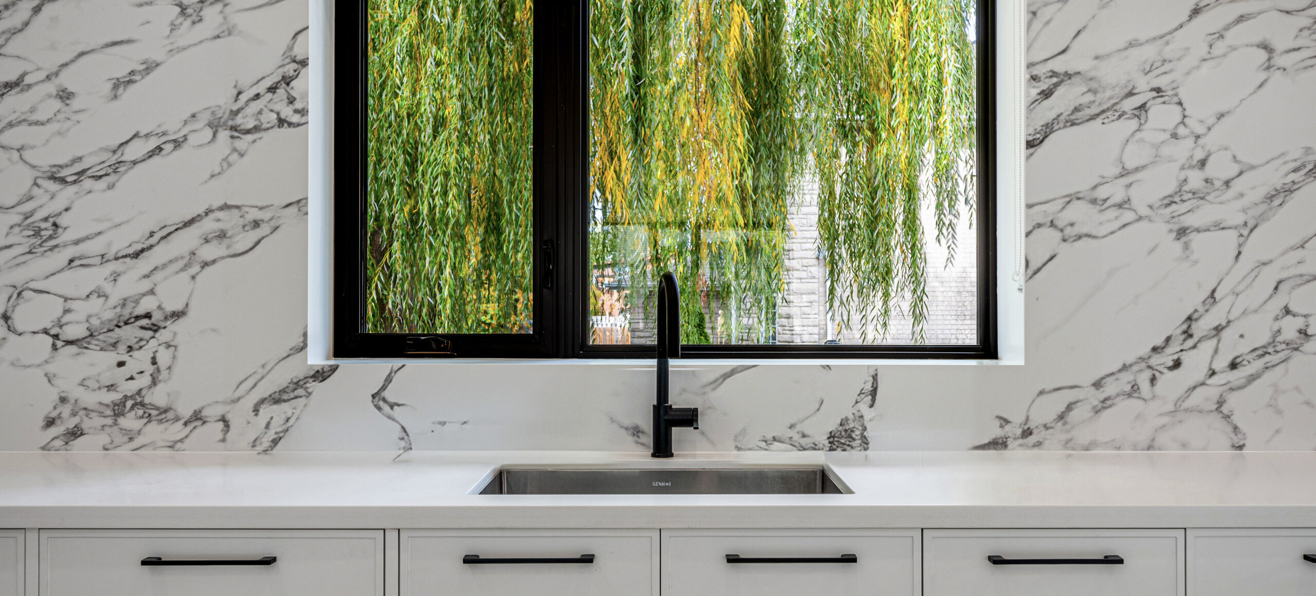 The kitchen, clad in natural stone, serves as a central focal point visible from both front and rear entrances. Its generous workspace enhances circulation and flexibility, supporting various cooking and prep activities. Prioritizing interconnectedness and safety, the open-plan layout ensures clear sightlines throughout, allowing parents to easily supervise their children. This thoughtful balance of style, function, and family needs makes the renovation both beautiful and practical.