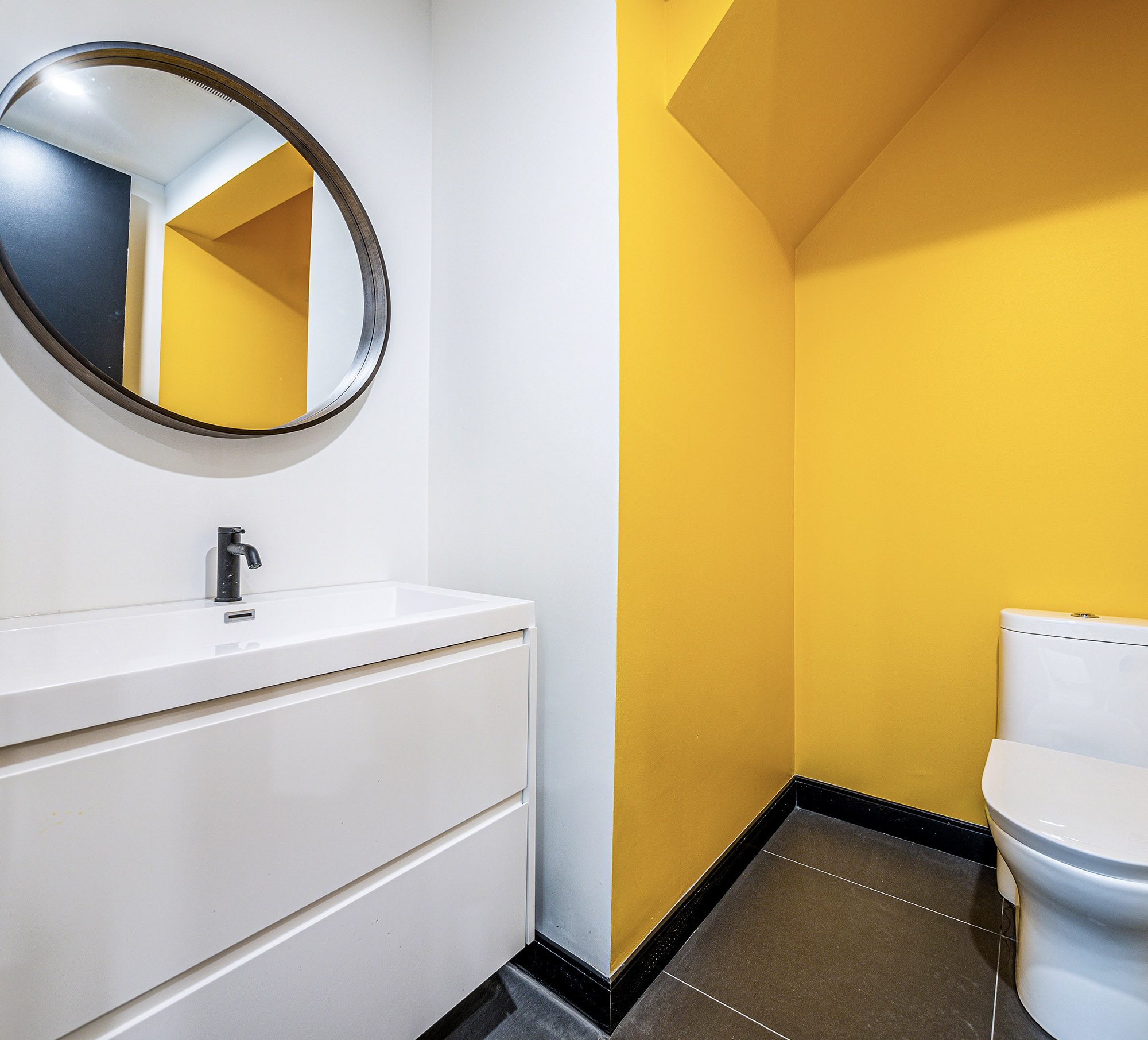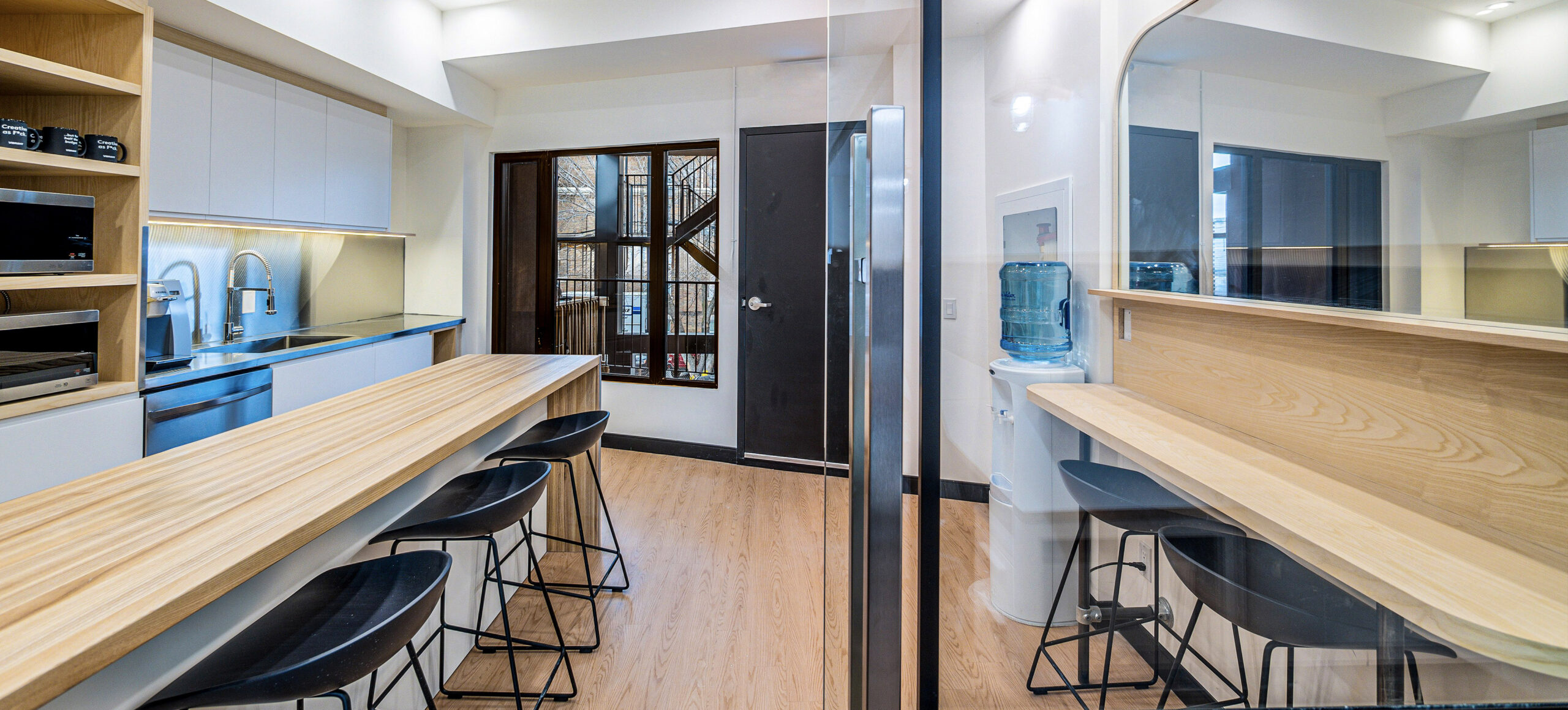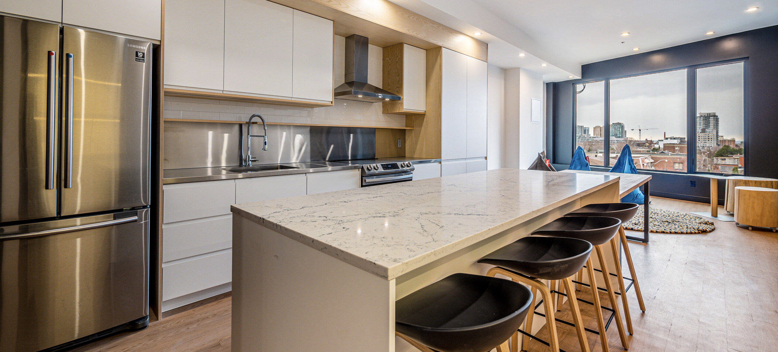 Our latest project transformed a narrow 2-story building into a dynamic 4-story space featuring both residential and office zones. Key elements include a hidden speak-easy at the entrance, two 800-square-foot suites with two bedrooms, two bathrooms, and open-concept kitchens, plus a rooftop with a pergola offering stunning CN Tower skyline views. Each space reflects our passion for creating distinctive environments that support modern living and working.